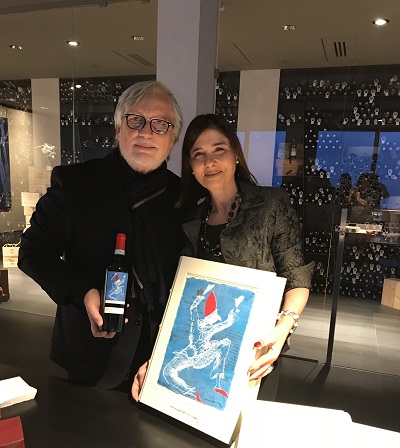 La confezione, in tiratura limitata e numerata, prevede tre bottiglie: due di Falerno del Massico rosso annata 2012 e una di Falerno del Massico bianco annata 2016. Due vini di spiccata personalità come il Falerno del Massico bianco, da uve Falanghina, e il Falerno del Massico rosso, da uve Aglianico e Piedirosso raccolte dopo accurata selezione nei vigneti collinari della tenuta di San Castrese, alle pendici del vulcano spento di Roccamonfina. Non casuale la sede della presentazione: il ristorante di Palazzo Petrucci a Posillipo che già accoglie alcune opere dell’artista, due sculture e la grande tela il Bosco incantato (tecnica mista su tela).